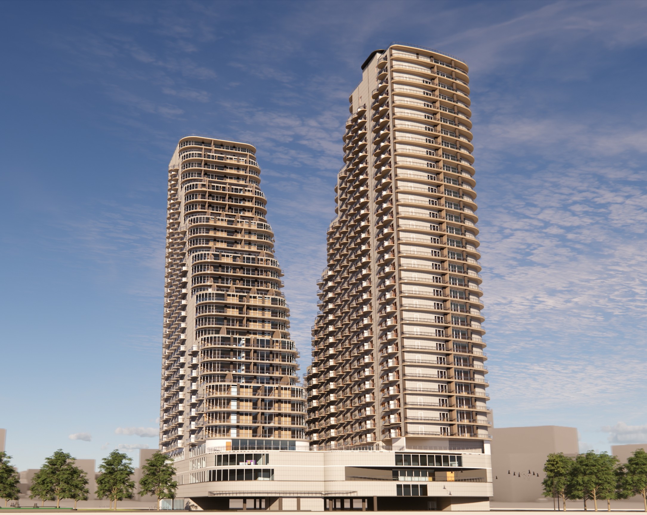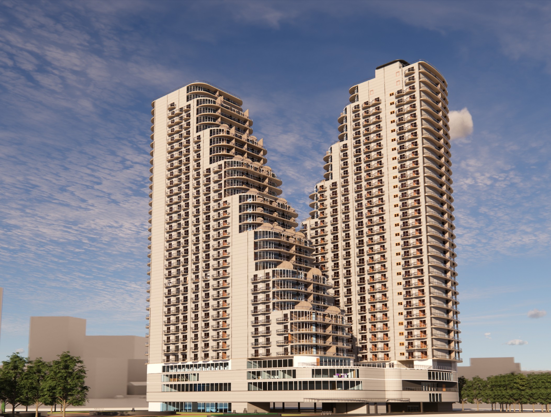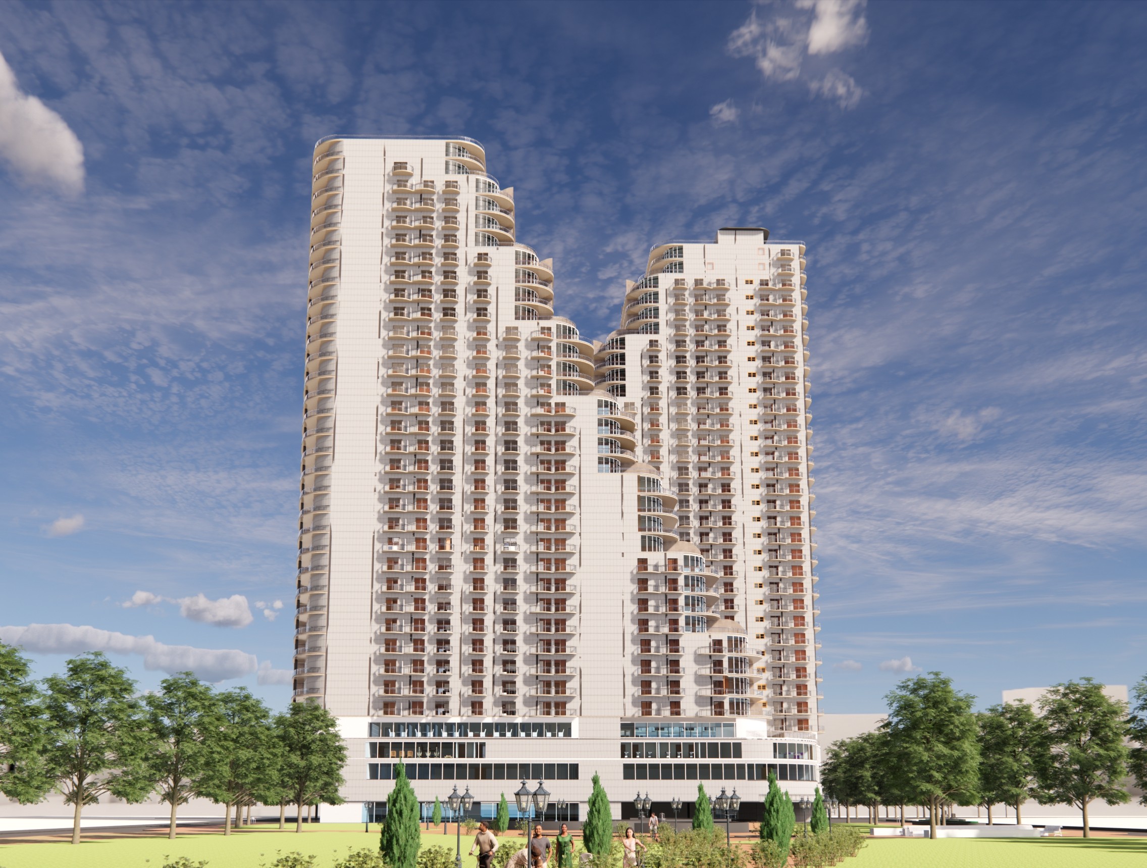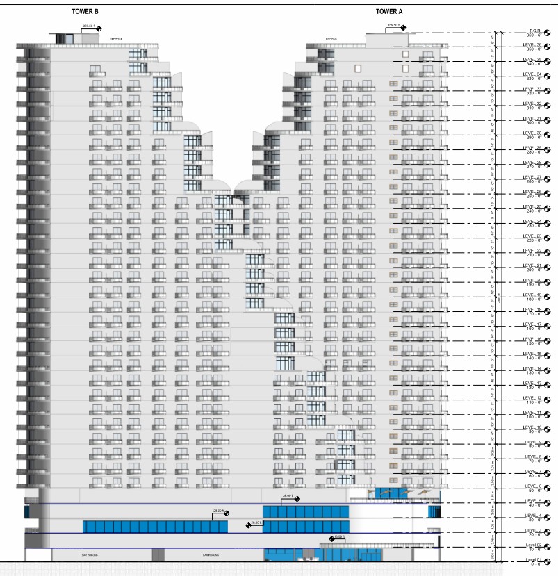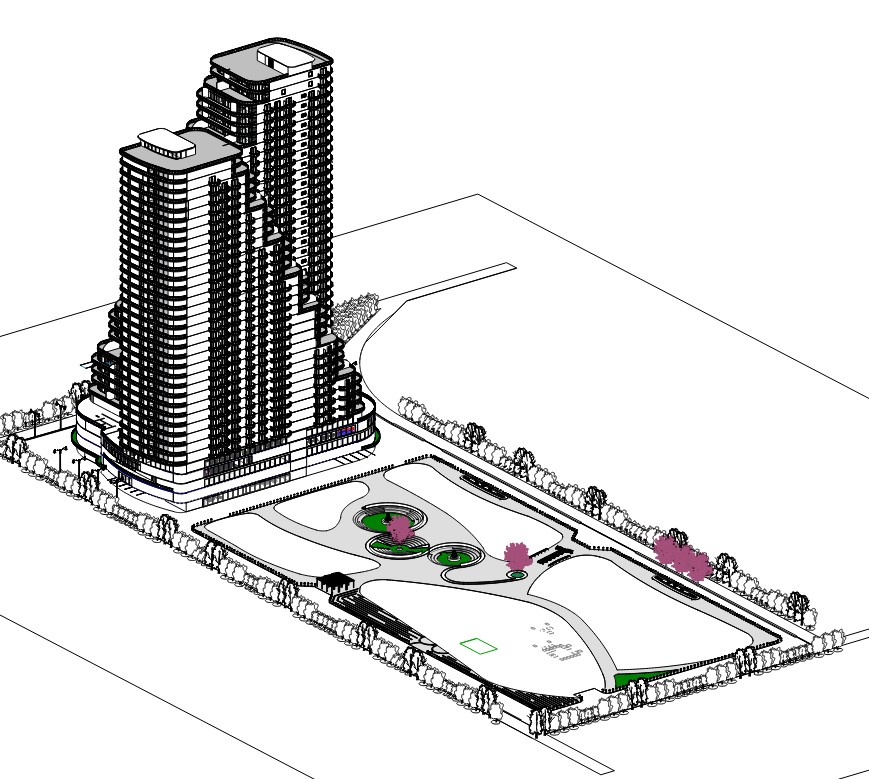 This high-rise residential project redefines vertical living through community-centric planning and architectural elegance. Designed as two interconnected towers, the development features studio, 2 BHK, and 3 BHK units from levels 6 to 33, with the top two levels dedicated to expansive duplex residences. The podium levels serve as an amenity-rich base with lobbies, salons, gyms, and theaters, while a central plaza and open sit-out areas create soft thresholds between built and open space.